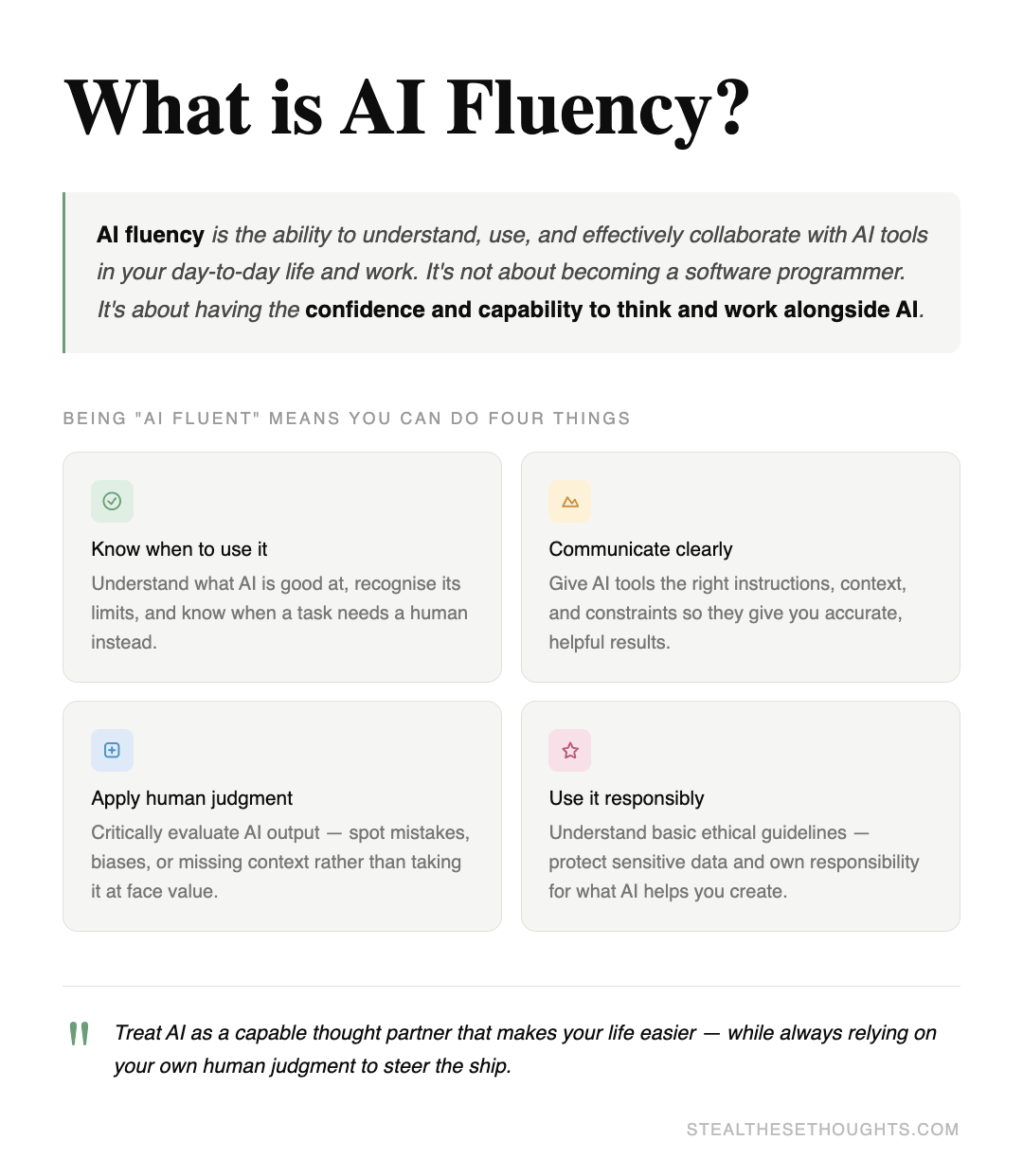 These frameworks acknowledge that using a generative AI tool, most popular being an LLM, is about more than the technical skill of using the tool alone. Personally, I like the term ‘AI fluency' because the technology moves so fast. Which means both the tech skills and behaviours you need to work with it are forever updating.