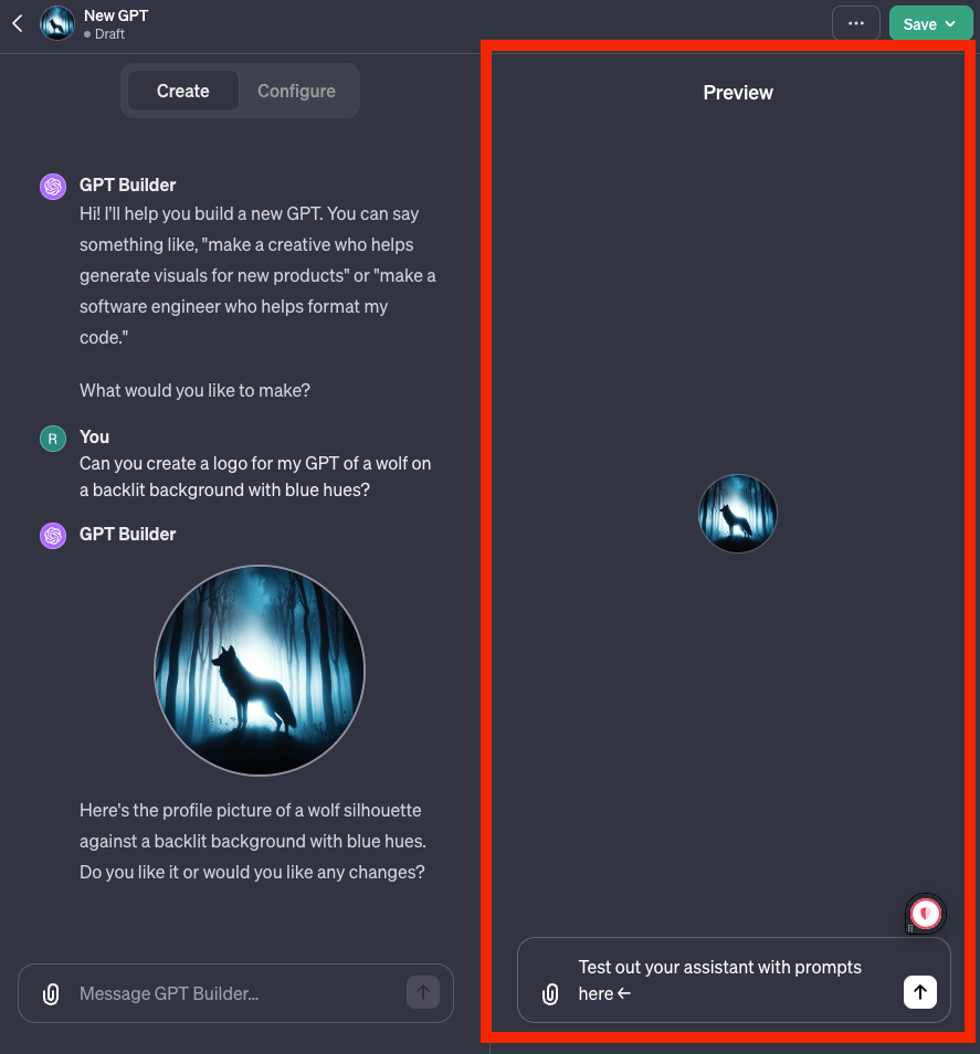 Here you can easily test your assistant and make any tweaks before you finish up. The cool feature with ChatGPT is you can see a split screen with the preview where you enter prompts on the right side and the left side enables you to make adjustments immediately.