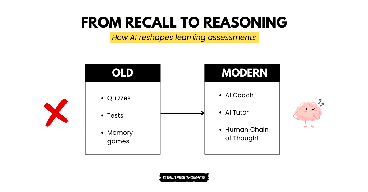 This is where AI tutors will play a big role. Instead of taking some stupid quiz or exam, you'll talk with a tutor to explain concepts, provide analogies and break down your human chain of thought.