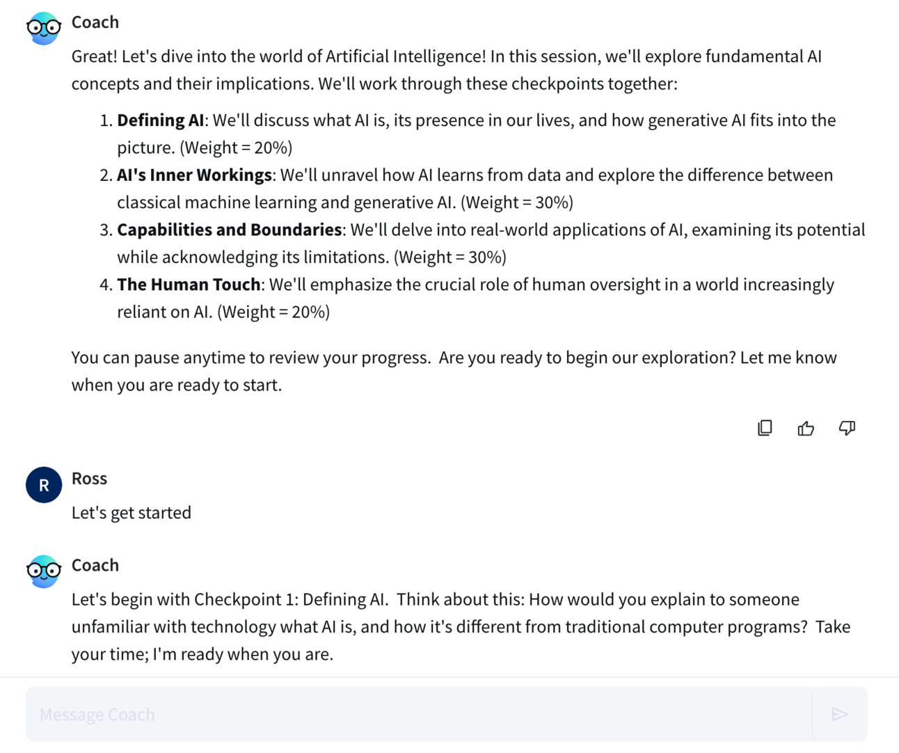 After hours spent learning about the wonderful components of machine learning, I’d talk with the AI coach to share what I learnt, answer its probing questions and explain how I would convey these learnings with others through examples and analogies.